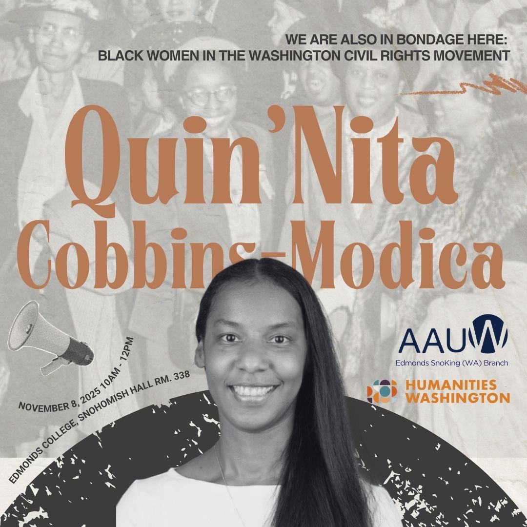 The Edmonds SnoKing Branch of AAUW will host Humanities Washington presentation, We Are Also in Bondage Here: Black Women in the Washington Civil Rights Movement by Quin’Nita Cobbins-Modica. The program will highlight how “… the 1960s ushered in a wave of political ferment in Washington State, Black women were the driving force behind civil rights campaigns to dismantle statewide racial segregation and discriminatory practices.”
